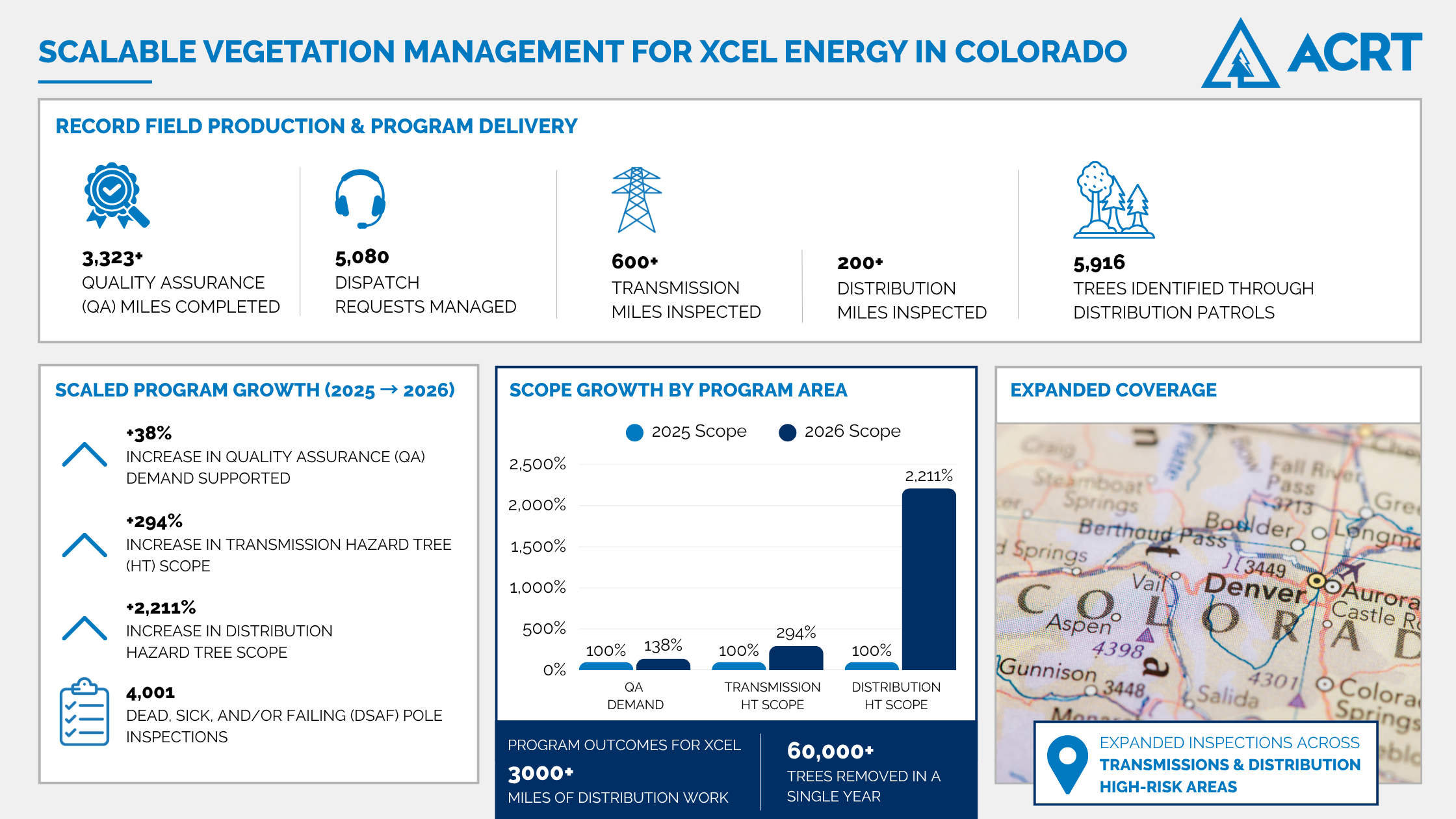ACRT helped Xcel Energy rapidly scale its wildfire mitigation and vegetation management program in Colorado — achieving record production, expanding scope, and maintaining compliance under increasing regulatory pressure.